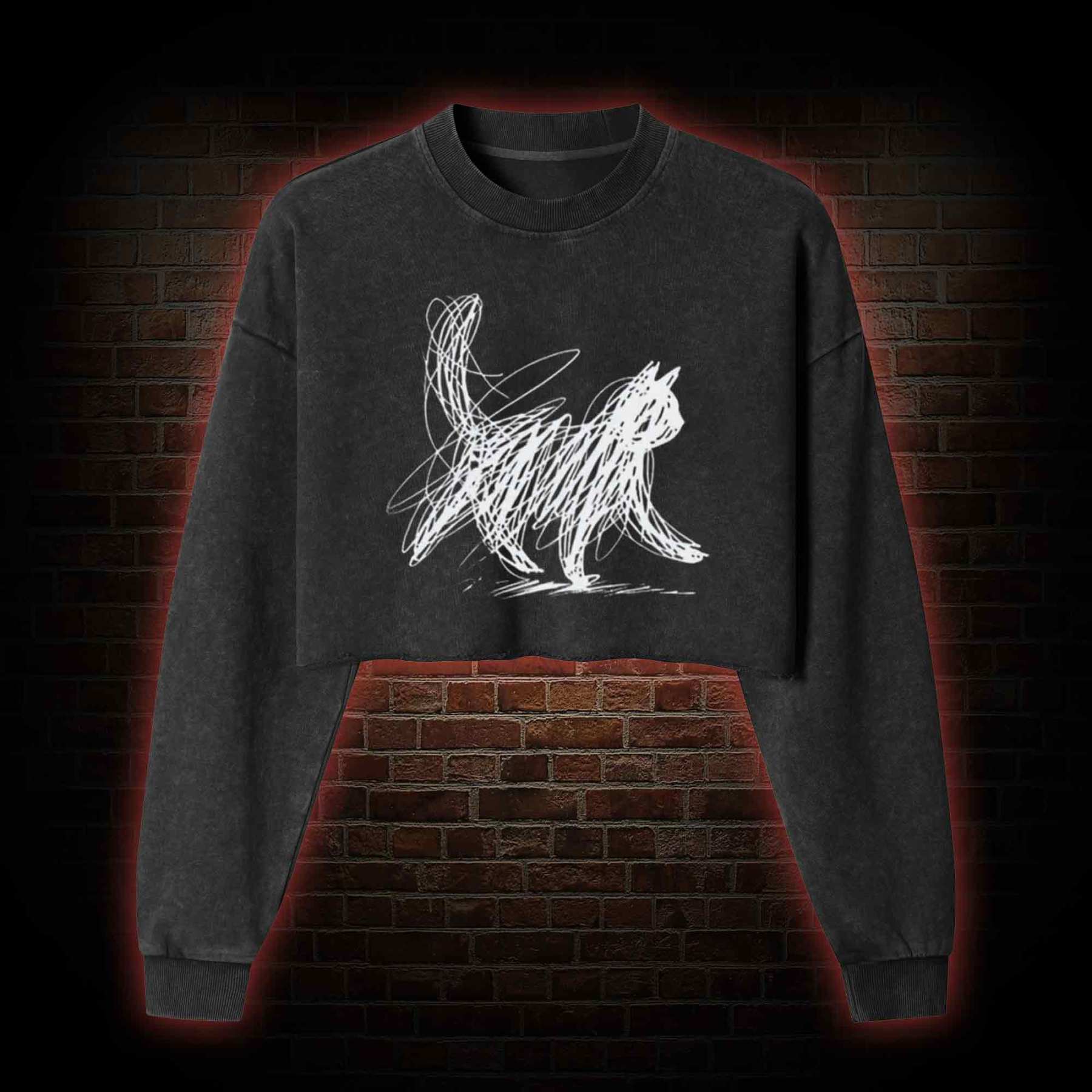 Cat Line Art Washed Cropped Sweatshirts