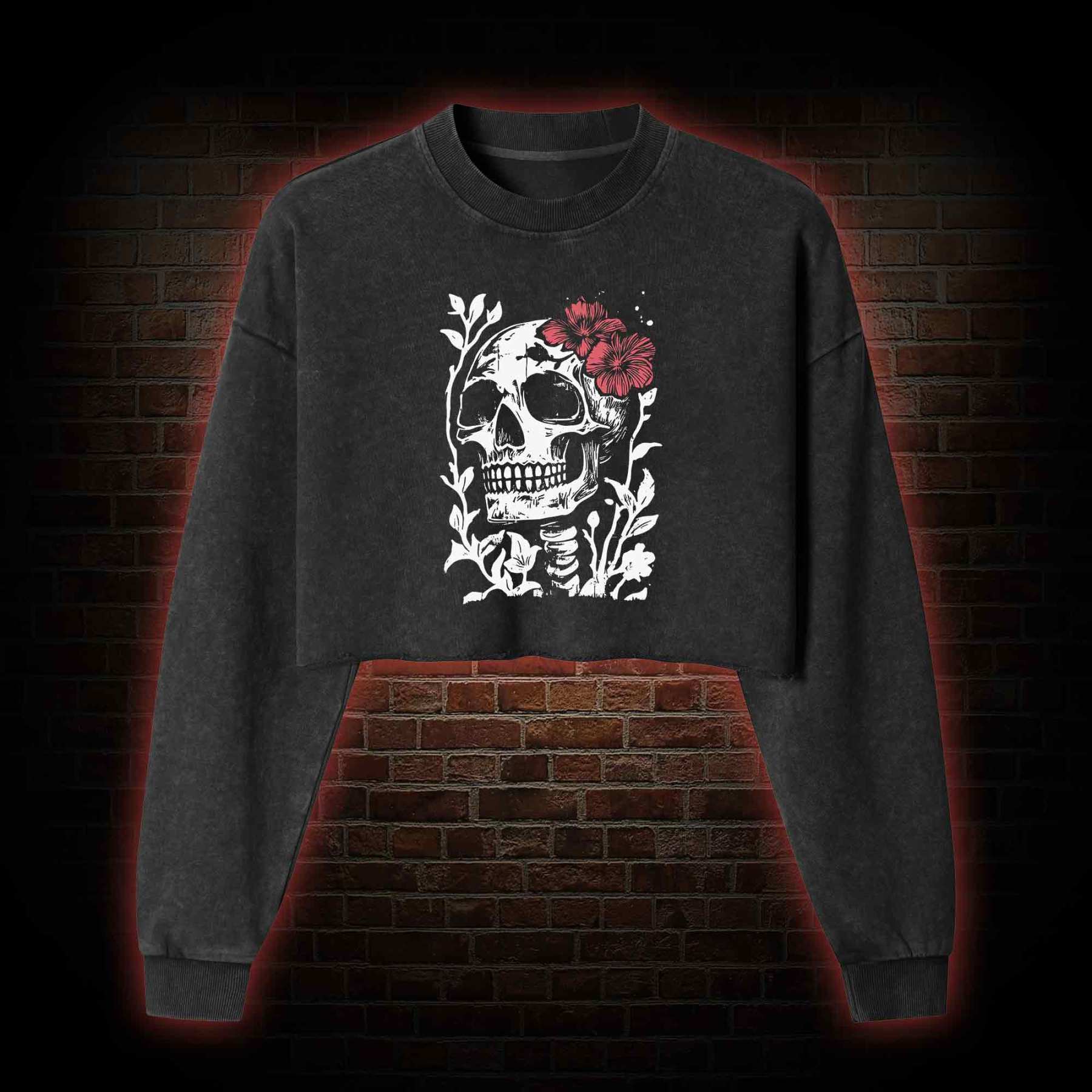 Flower Skull Washed Cropped Sweatshirts