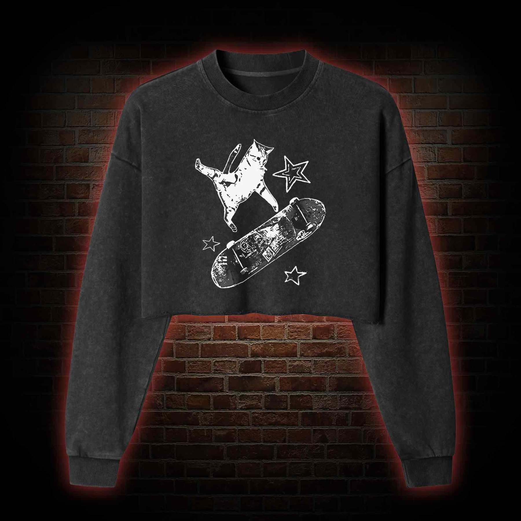 Skateboard Cat Washed Cropped Sweatshirts